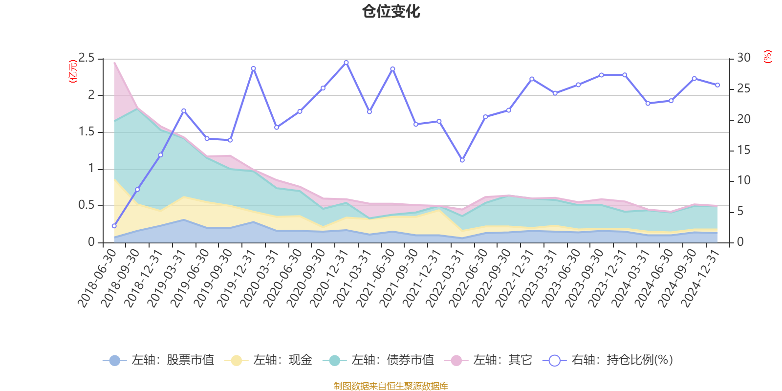 据定期报告数据统计,近三年平均股票仓位为23.78%,同类平均为41.78%。2020年末基金达到29.37%的最高仓位,2018年上半年末最低,为2.73%。